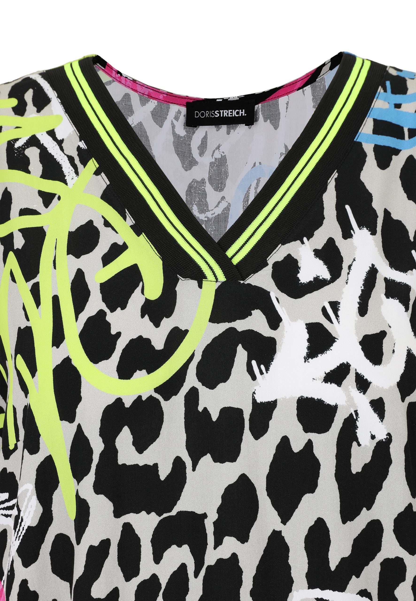 Die außergewöhnliche Bluse von Doris Streich vereint mutiges Design mit maximalem Komfort und ist damit ein Must-have für alle, die Mode als Ausdruck ihrer Persönlichkeit verstehen. Der schwarze und graue Leo-Print bildet die Basis des Looks, während neonfarbene Graffiti-Akzente in Pink, Gelb, Blau und Weiß der Bluse einen urbanen, künstlerischen Touch verleihen. Dieses Zusammenspiel aus Animal-Print und Street-Art macht das Modell zu einem echten Hingucker, der jedes Outfit aufwertet.